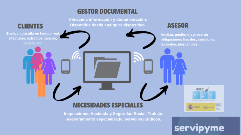 - Una vez que los documentos son cargados por el cliente, recibe una notificación de confirmación, el asesor de SERVIPYME los revisa, se procede así a su seguimiento, intercambio de archivos, etc . Igualmente el asesor de SERVIPYME actualiza periódicamente la información documental del cliente: impuestos, contabilidad, otros trámites que se pudieran generar, etc. Todo ello bajo un sistema de gestión de documentos adaptados tecnológicamente en favor de nuestros clientes.